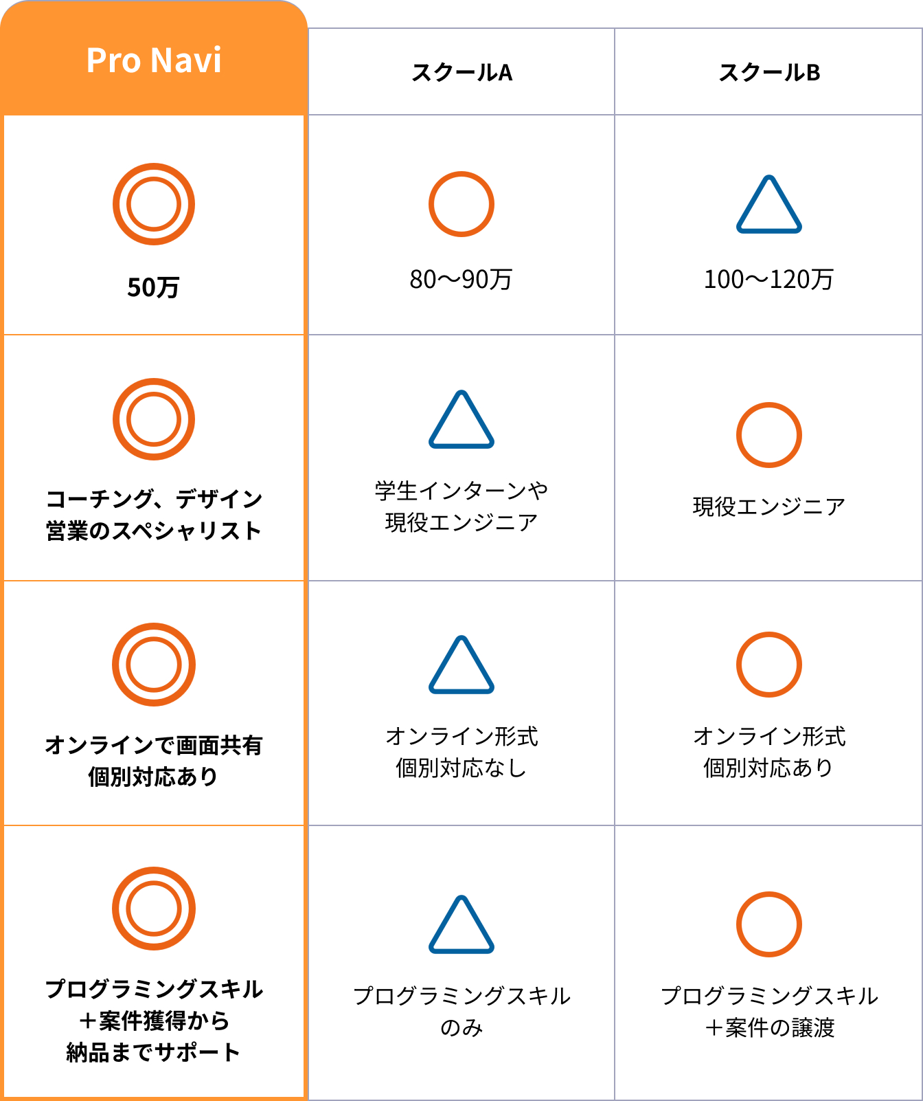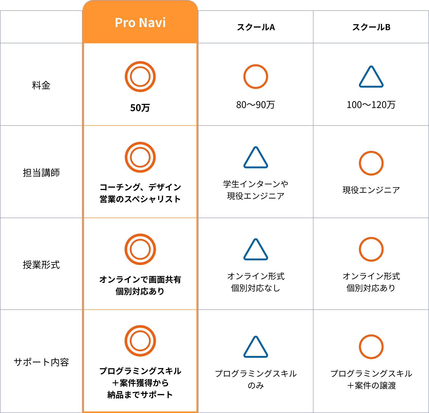 ProNaviにはコーディング、デザイン、案件獲得、それぞれ現役のスペシャリストが在籍。週一回エンジニアとマンツーマンで行います。コーディングだけでなくデザイン、案件獲得のスペシャリストも在籍していることから、これらのスキルも詳しく学ぶことができます。